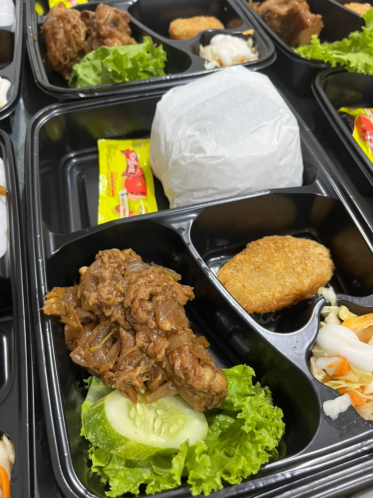 Nasi Putih, Ayam Teriaki, Nugget/Rolade, Salad, Chili Sauce & Tomato Sauce