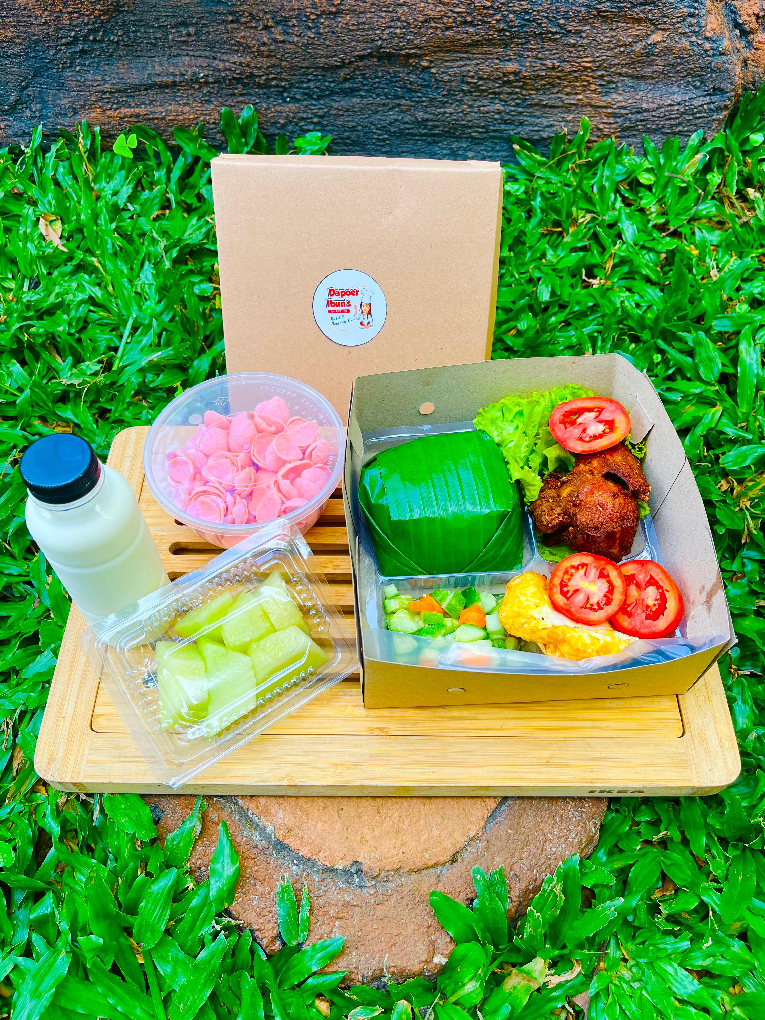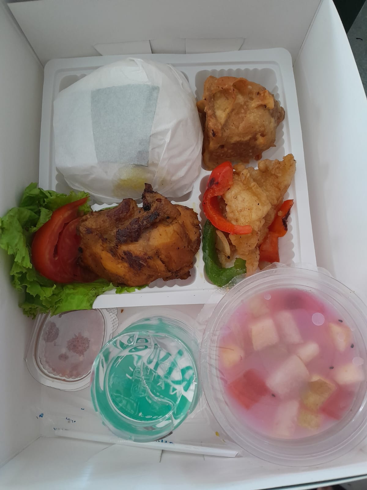 Nasi Putih, Ayam Bakar, Dory Cah Paprika, Tahu Berontak, Sambal, Air Mineral, Es Buah