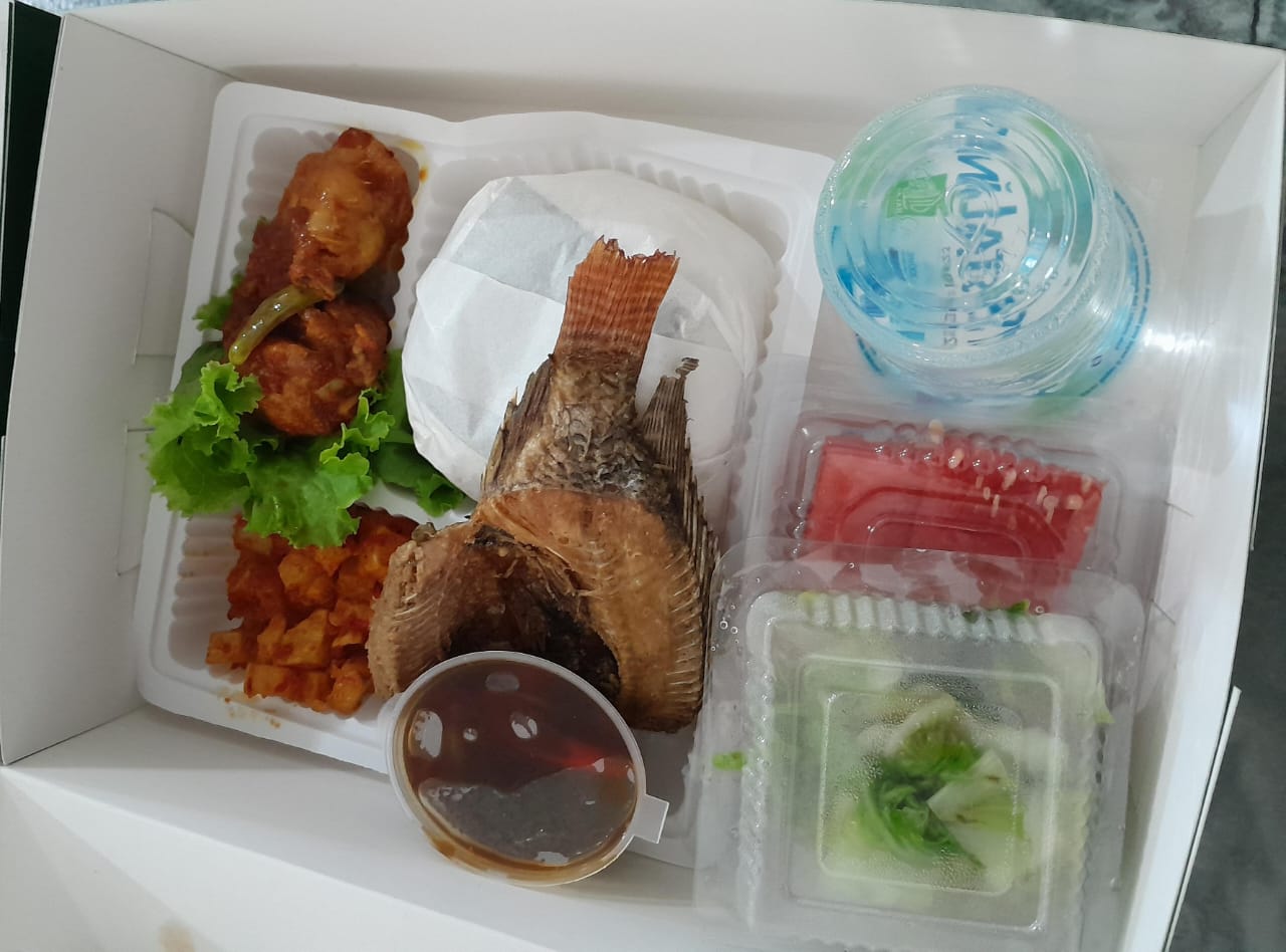 Nasi Putih, Ikan Nila Goreng, Empal, Tahu Bacem, Sayur Asam, Sambal,Buah, Air Mineral