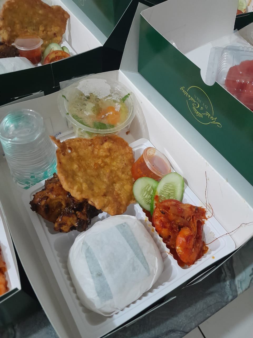 Nasi Putih, Ayam Bakar, Udang Asam Manis, Bakwan Jagung, Soup Sayuran Bakso, Sambal,Buah, Air Mineral