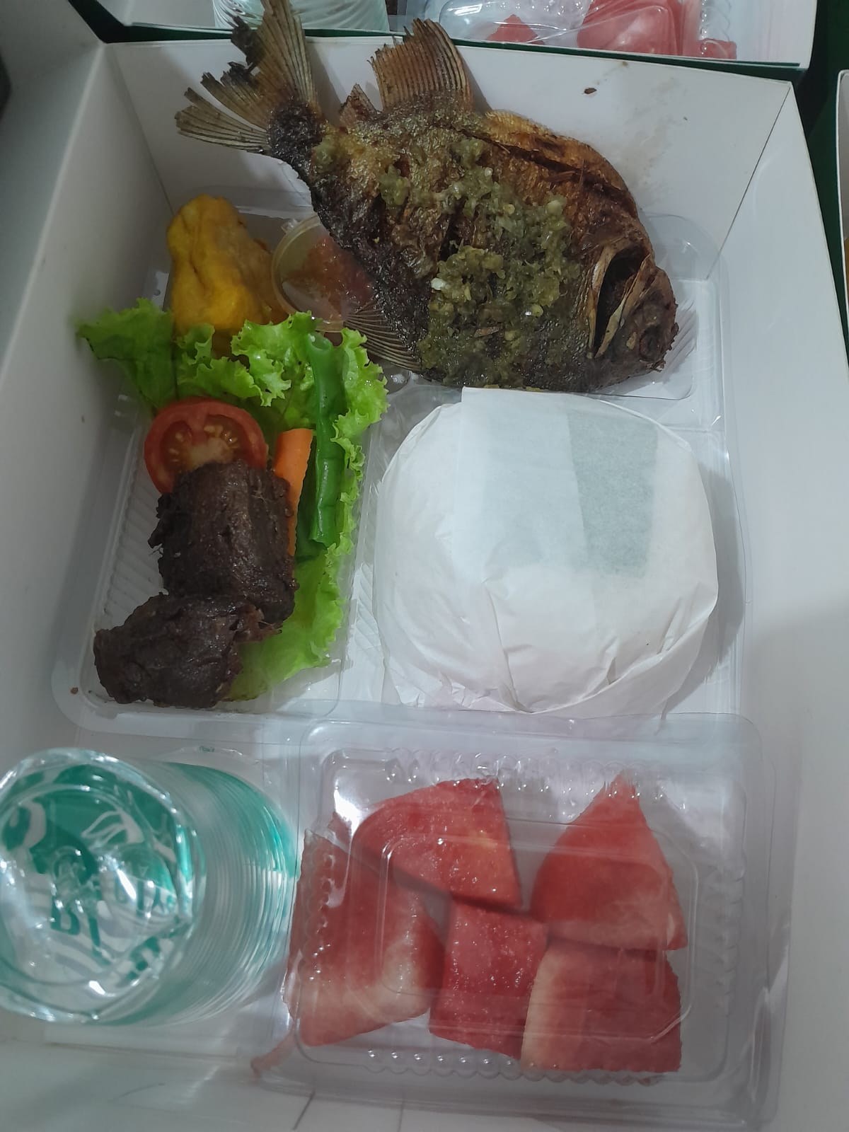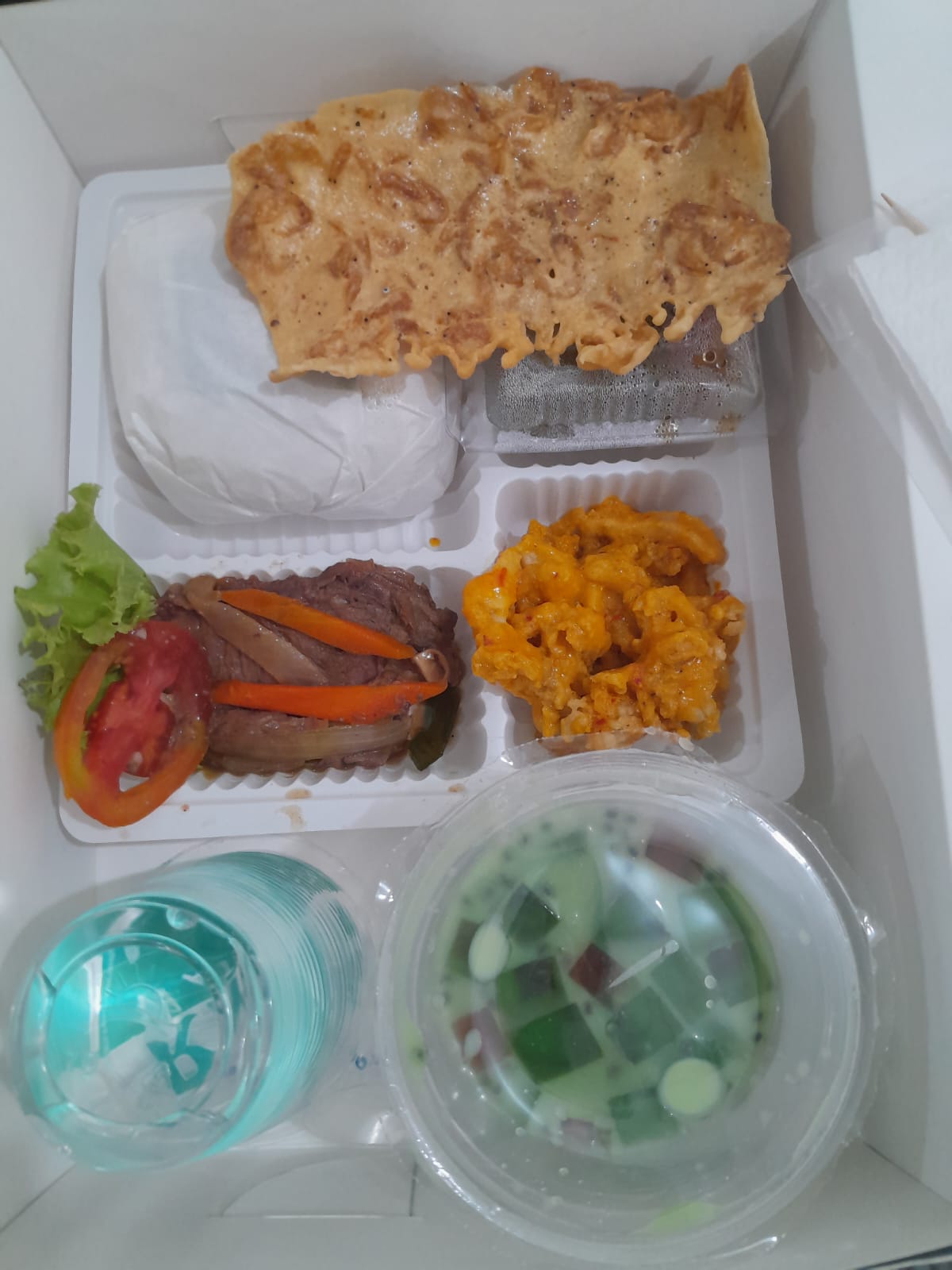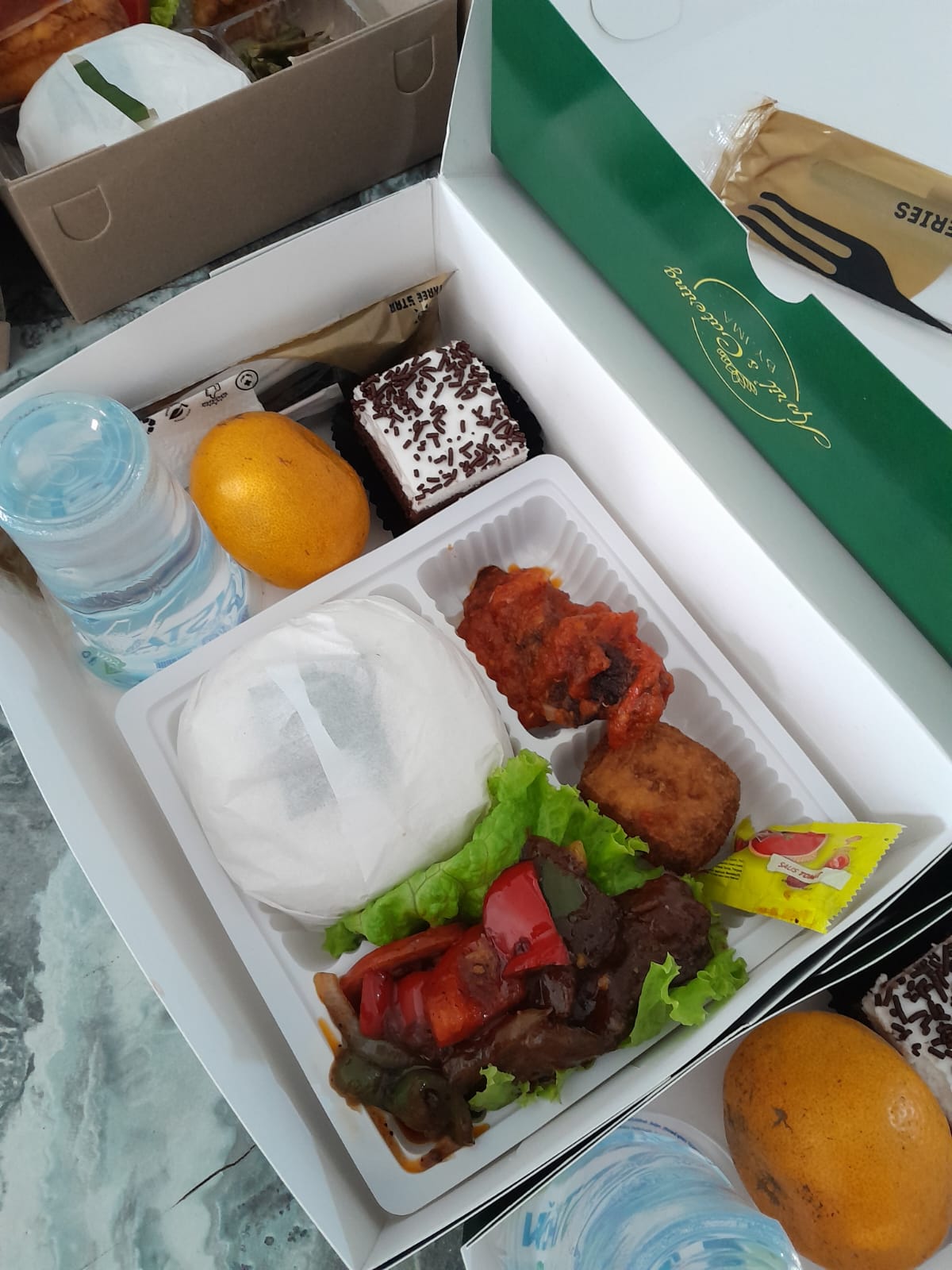 Nasi Putih, Daging Paprika, Ayam Goreng Balado,Tahu Bandung, Buah, Pastry, Air Mineral