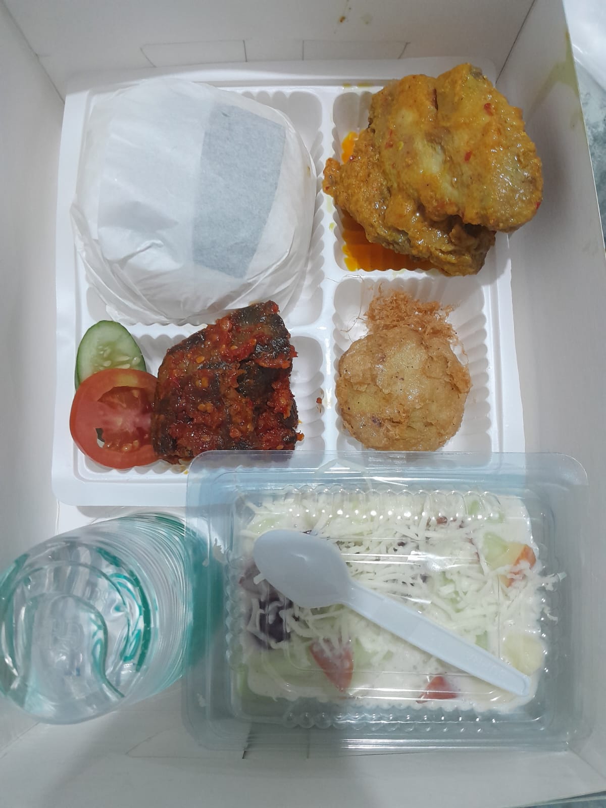 Nasi Putih, Ayam Rica-rica, Paru Goreng Balado, Perkedel Kentang, Sambal, Air Mineral, Salad Buah
