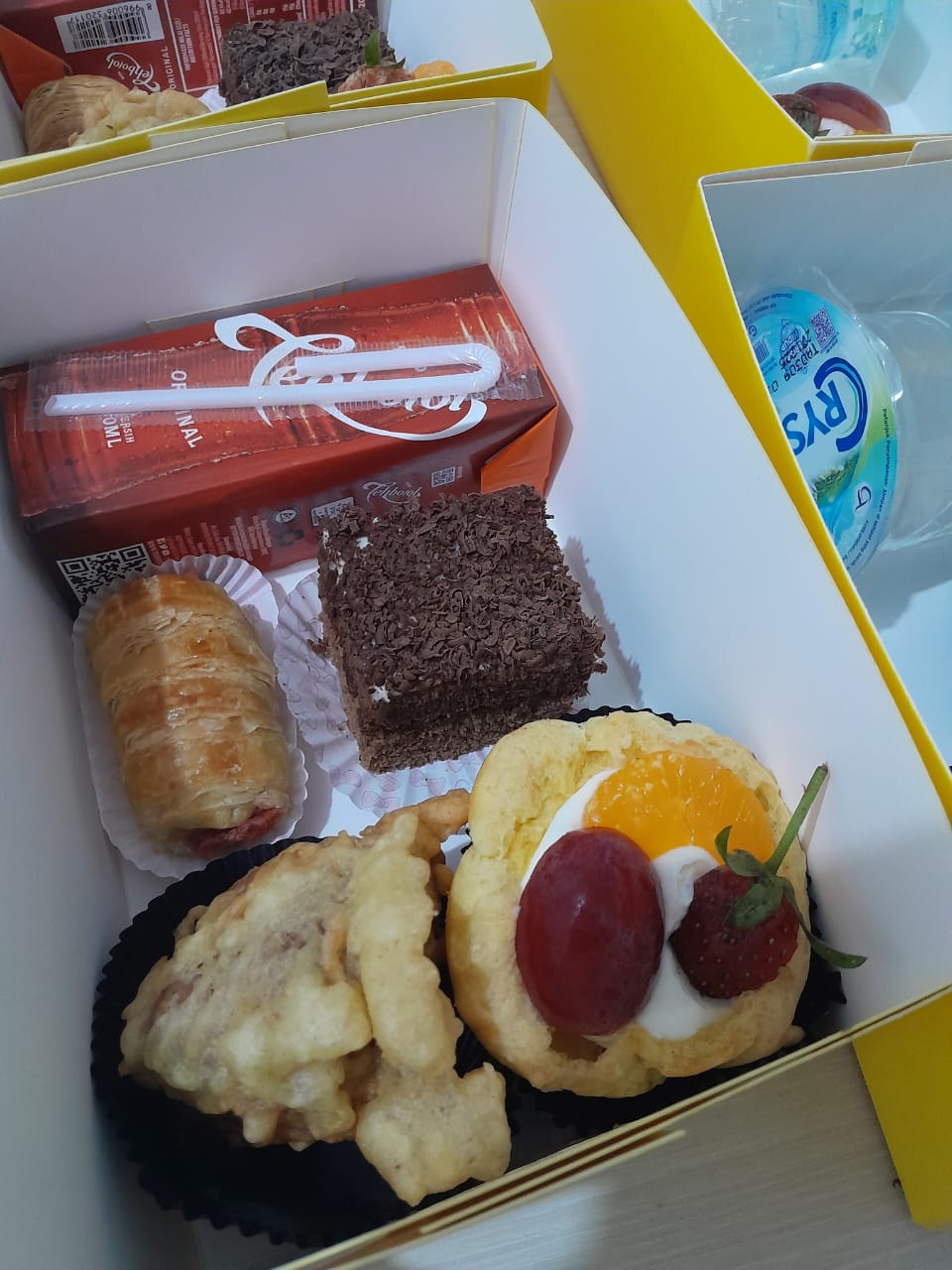 Soes Buah, Cake Coklat, Tahu Berontak, Puff Sosis, Teh Kotak