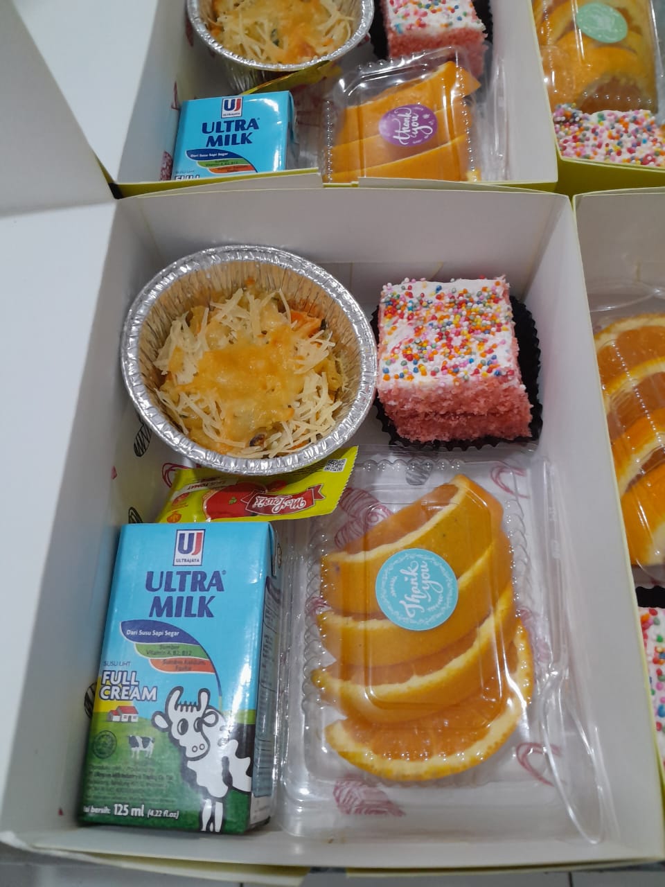 Makaroni schotel, Cake Strawberry, Jeruk Sunkist, Susu Kotak